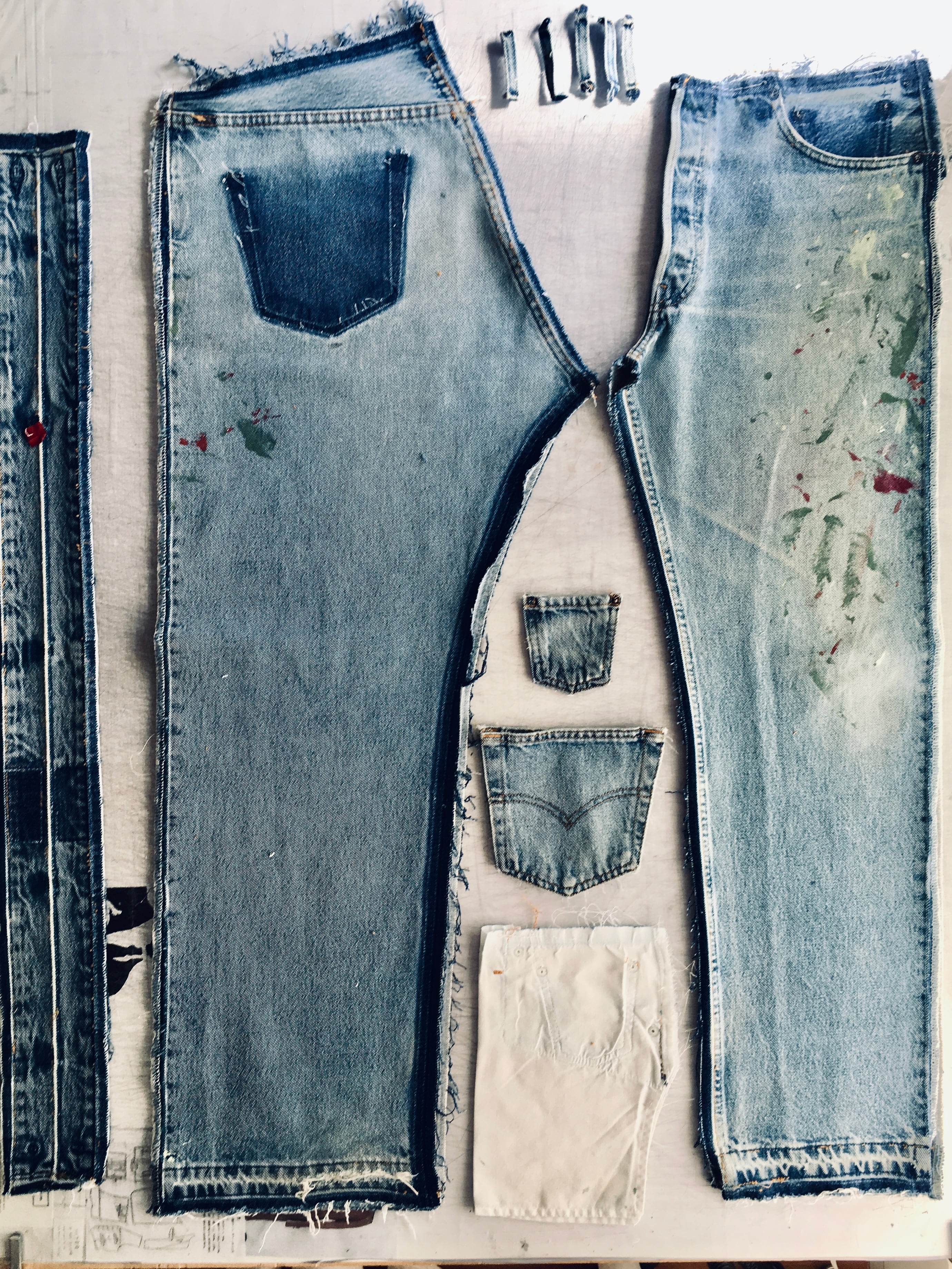 また、作業工程としてパーツ解体(地縫糸、ステッチをほどく)→プレス(アイロンで形を整える)→新たな型紙へ裁断→縫製(ハンドメイド)→プレス(仕上げアイロン) 自らすべての工程(型紙を含め)を自分自身で作成しています。
